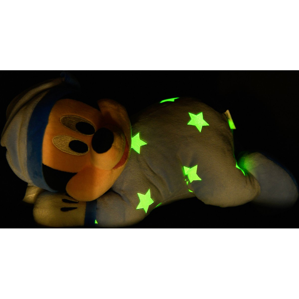 This adorable Mickey Mouse bedtime plush wears a blue pyjama with stars and a cosy nightcap and lies on his belly with his head resting on his hands as if he is sleeping. The stars on the pyjamas absorb light and glow in the dark, providing comfort and reassurance at bedtime. The plush material is incredibly soft and cuddly, making it perfect for naps, bedtime routines and relaxation.