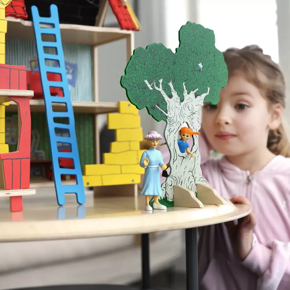 Villa Villekulla is an inspiring dollhouse that invites you to play in Pippi's world. The dollhouse is open from three sides, so several children can explore and play together in the dollhouse. The set includes 1 door, balcony, veranda, 2 floors, attic, ladder and 1 soda tree for the figures to crawl through. Figures and furniture are sold separately.