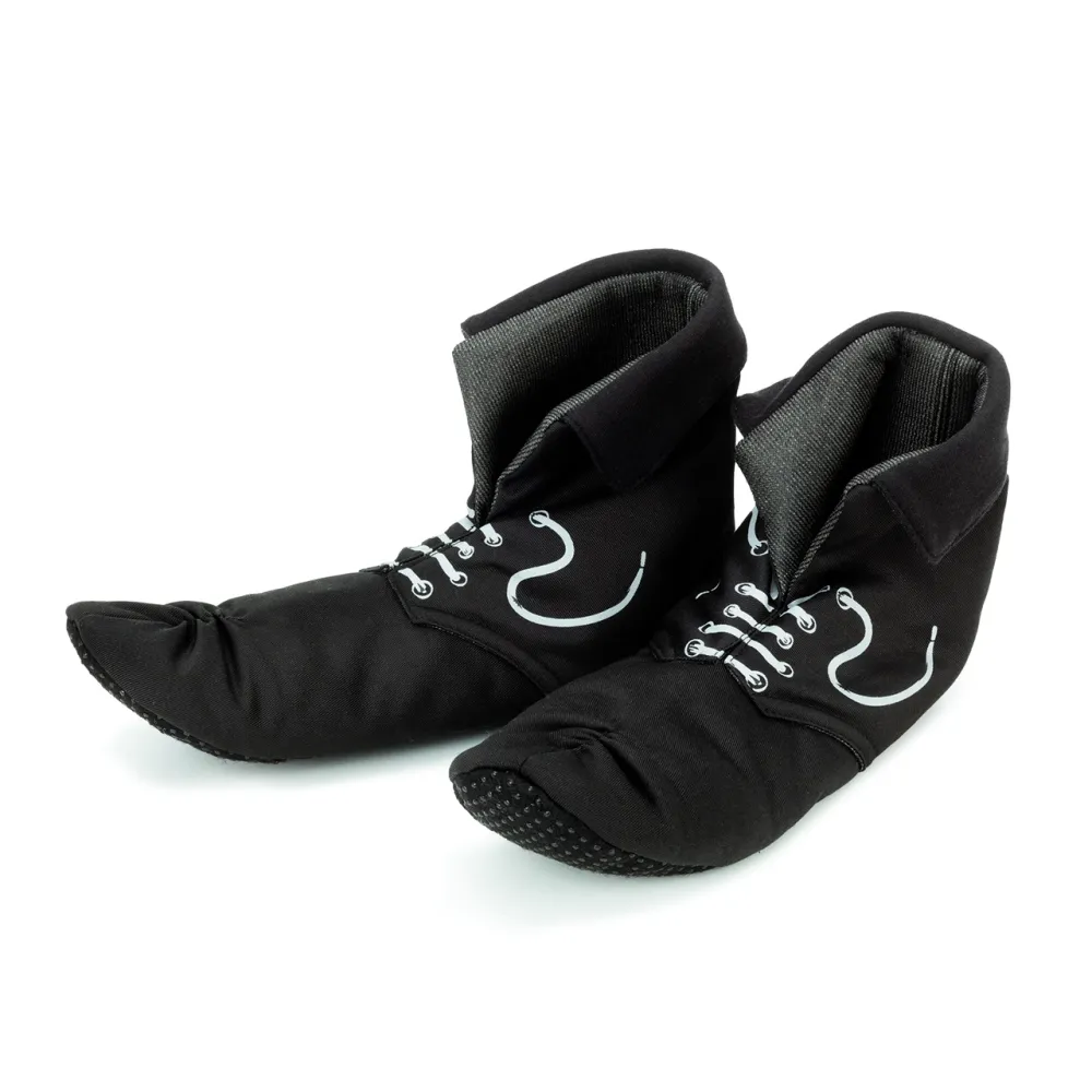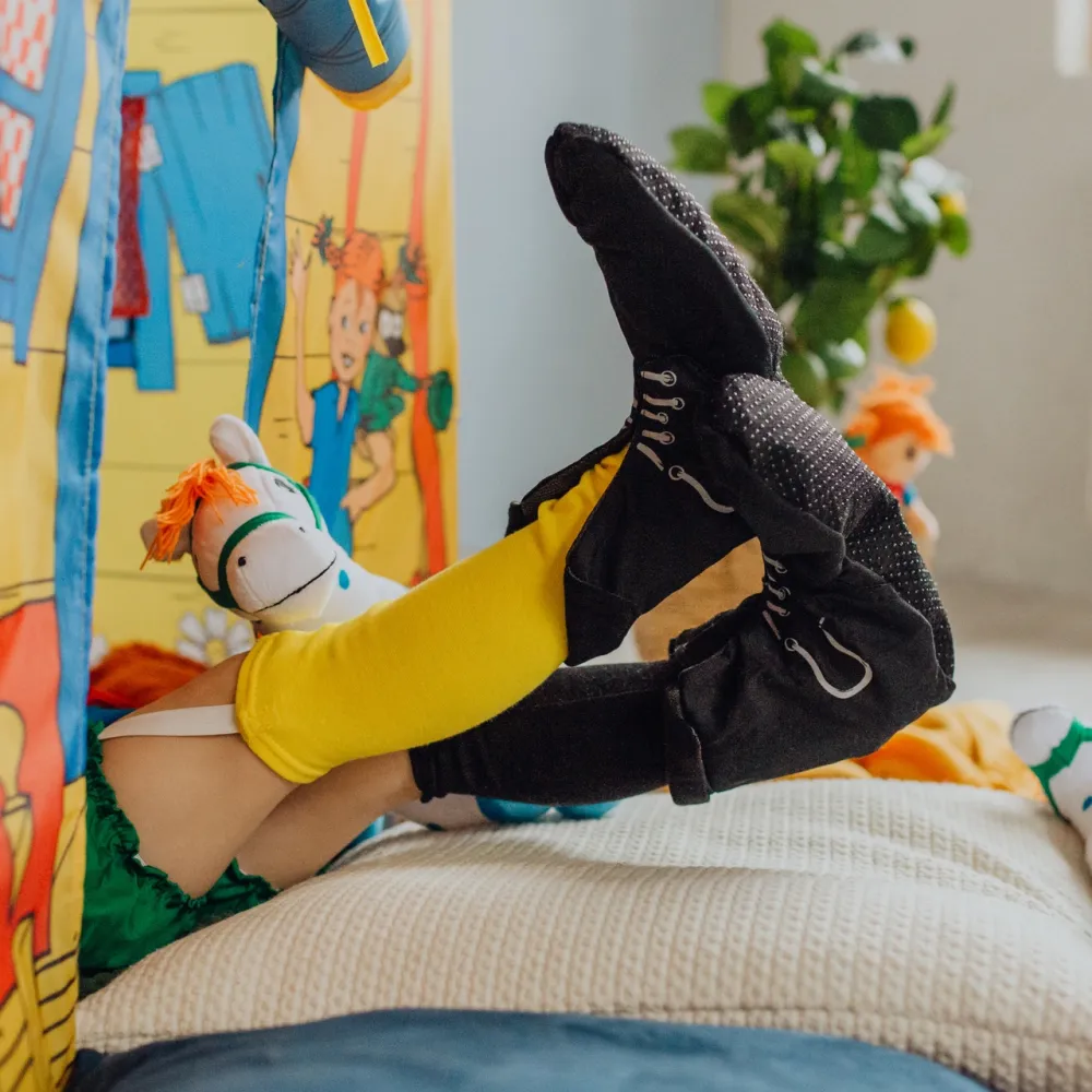 Voici les bottes de Fifi dans une version douce pour jouer, avec beaucoup d'espace pour remuer les orteils. Avec leurs lacets imprimés et leurs poignets tricotés, elles sont très faciles à enfiler et à enlever tout seul. Les semelles antidérapantes te permettent de sauter en toute sécurité sans glisser. Complète tes bottes en les habillant avec des vêtements et une perruque Fifi et transforme-toi en Fifi Brindacier pour de vrai !