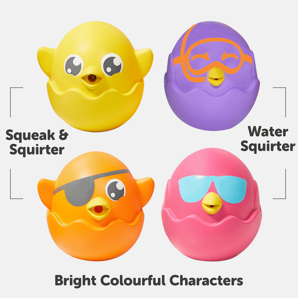 Inspirés des œufs à cacher et à faire couiner de Toomies, ces quatre poussins en train d'éclore ont quitté leur boîte à œufs, prêts à s'amuser pendant des heures à l'heure du bain. Fabriqués dans un matériau souple, ils sont faciles à tenir et à presser pour les petites mains. Plongez-les dans la baignoire et regardez-les flotter à la surface. Pressez-les pour les remplir d'eau, puis pressez-les à nouveau pour faire jaillir l'eau. Avec des visages amusants et des couleurs vives pour stimuler l'imagination, chaque personnage a sa propre histoire et sa propre personnalité. L'un d'eux porte un tuba et un masque de plongée, un autre un cache-œil, un autre encore est bronzé et porte des lunettes de soleil - et Sora, le poussin jaune, est tout simplement mignon.