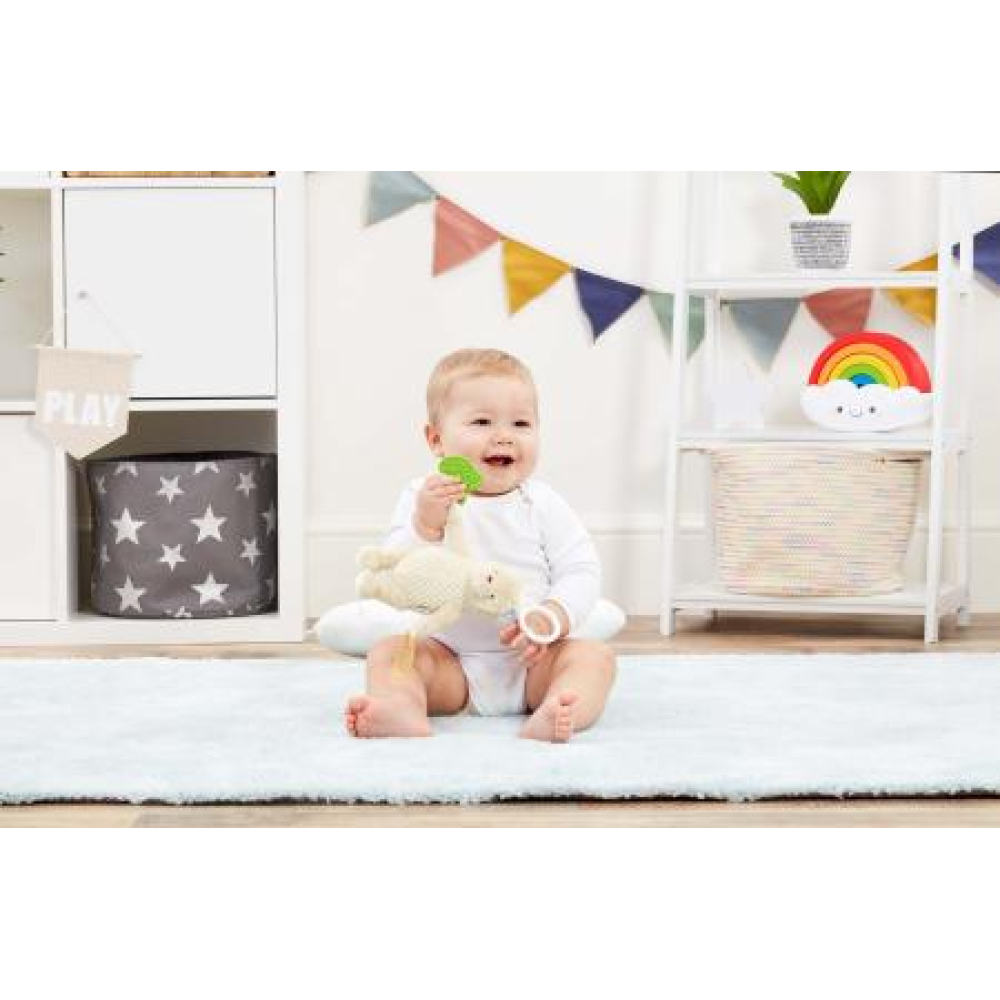 Doux comme une peluche et adapté dès la naissance, ce jouet sensoriel émet un grelot et un couinement pour stimuler les sens de bébé et encourager son développement précoce.