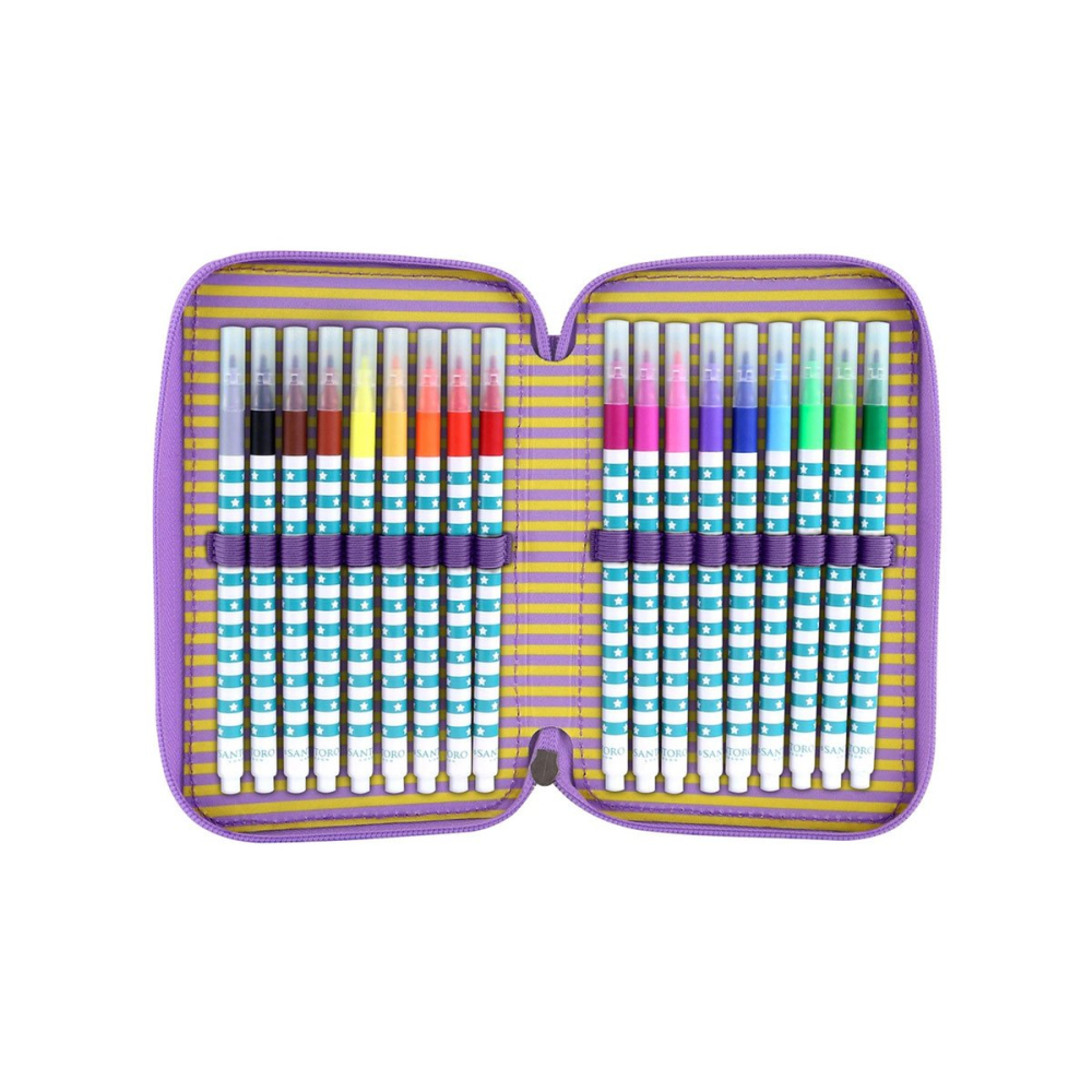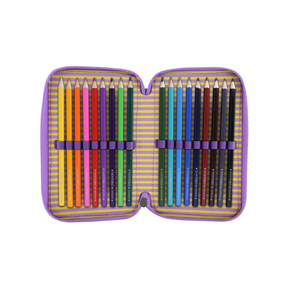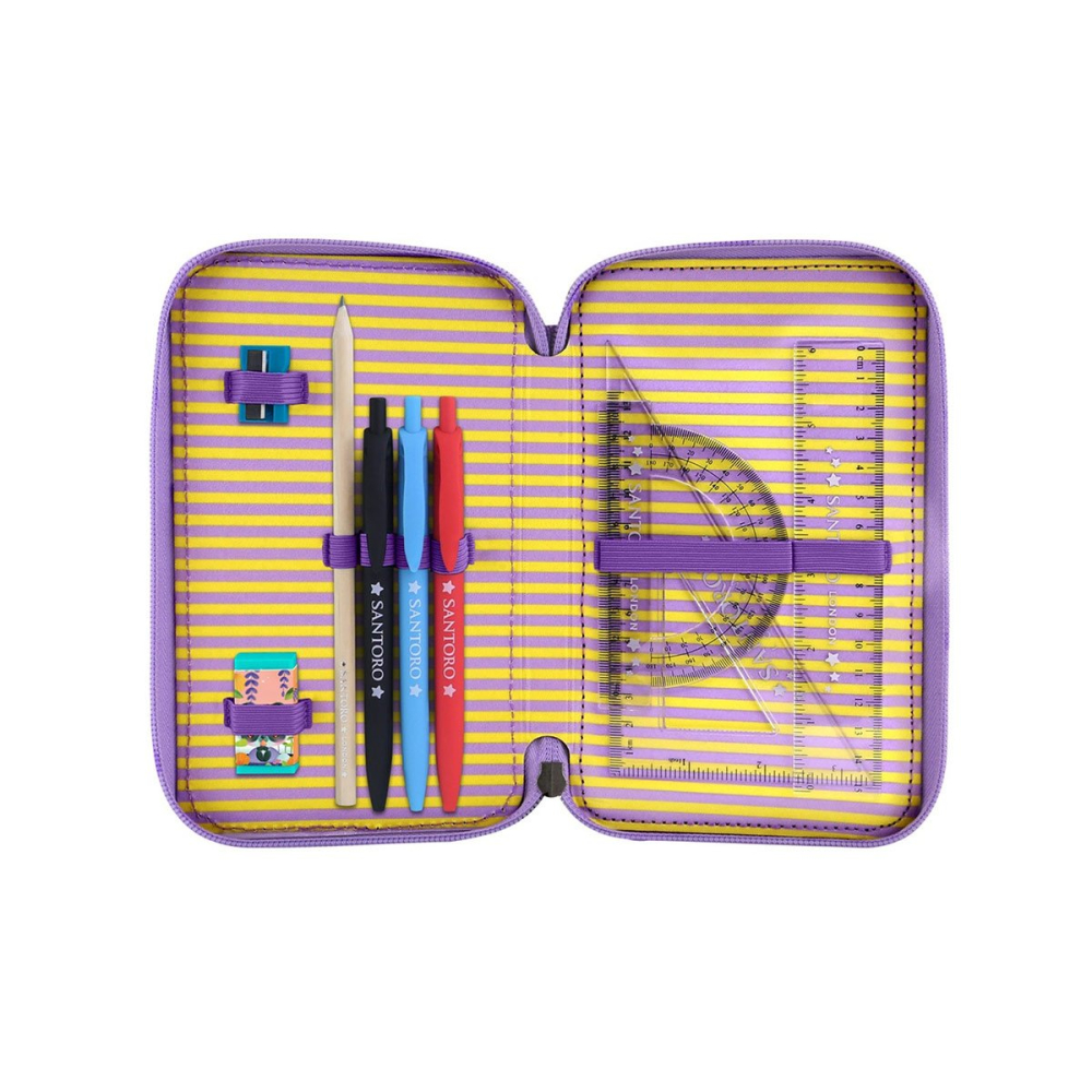Het Bangoberry Pally Panda drievaks gevuld etui is de perfecte schoolaccessoire voor creatieve kinderen! Het etui heeft drie ruime ritsvakken, elk gevuld met een complete set schrijfwaren: kleurpotloden, viltstiften, balpennen, een liniaalset, gum, slijper en meer.