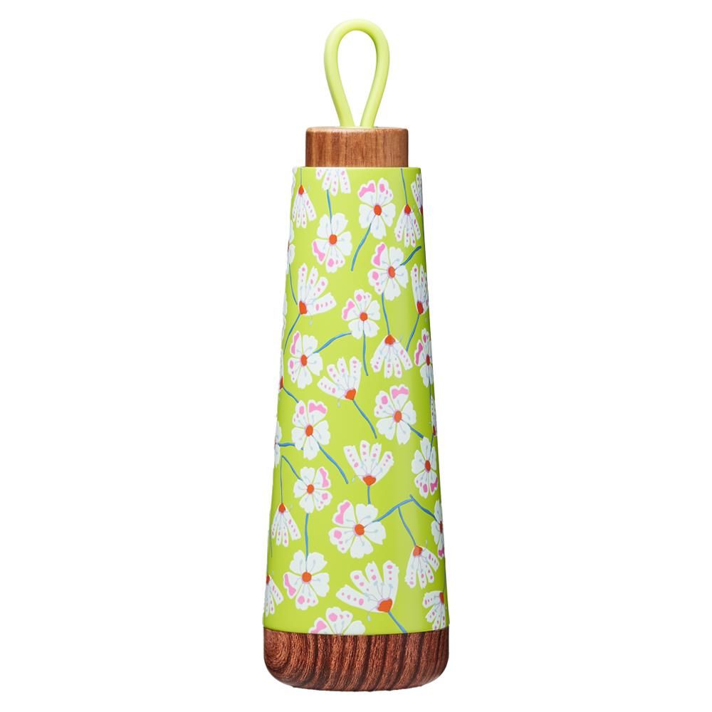 De fles is vervaardigd uit dubbelwandig roestvrij staal en houdt dranken tot 18 uur warm en 12 uur koud. De houten dop met siliconen draaglus zorgt voor een natuurlijke uitstraling en extra draagcomfort. Volledig BPA-, ftalaat- en toxinevrij.