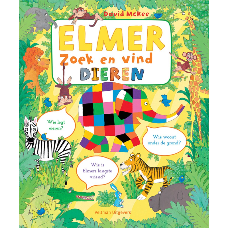 Elmer – zoek en vind (dieren) is een charmant zoekboek van David McKee waarin kinderen uitgedaagd worden Elmer op elke pagina terug te vinden in het weelderige oerwoud. Tegelijkertijd leren ze leuke, boeiende dierenweetjes over zijn wilde vriendjes. Het boek heeft stevige hardcover en telt 22–24 pagina’s, ideaal voor nieuwsgierige kleuters.