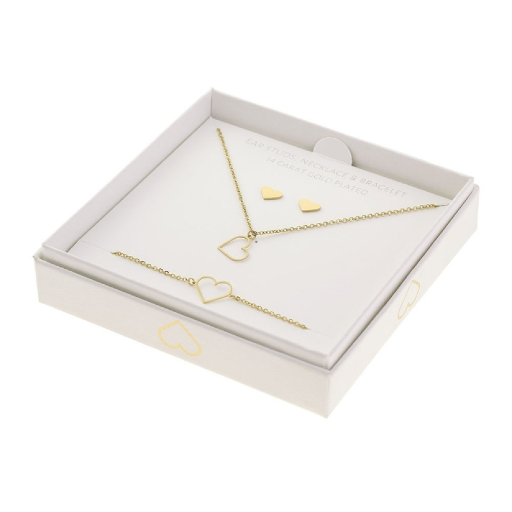 Klassiek ontmoet modern... onze productontwerpers hebben de uitstekende kwaliteit op de voorgrond geplaatst: 14 karaats verguld. Een stijlvolle cadeauset bestaande uit oorbellen, een armband en een halsketting. Prachtig verpakt in een crèmekleurige geschenkdoos met glanzende hotfoil stempeling. Deze glamoureuze uitstraling laat de harten van je klanten sneller kloppen.