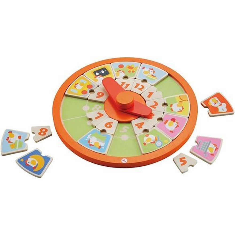 De klok bestaat uit 24 houten puzzelstukken: 12 cijfers voor de uren en 12 illustraties met dagactiviteiten. Dankzij het stevige hout, de zachte vormen en de heldere kleuren is dit speelgoed perfect afgestemd op kleine kinderhanden.