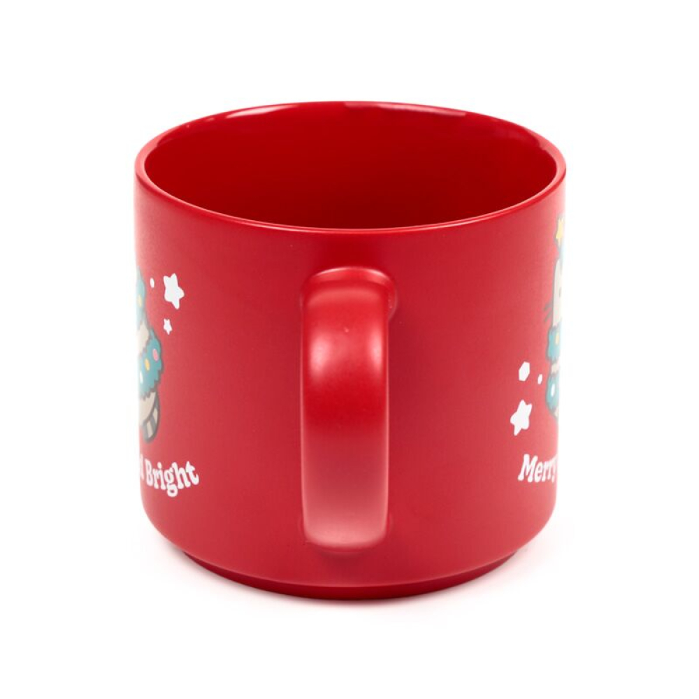 Deze vrolijke rode mok toont Pusheen verkleed als kerstboom met de tekst “Merry and Bright” — perfect voor het drinken van warme chocolademelk, thee of koffie tijdens koude winterdagen.