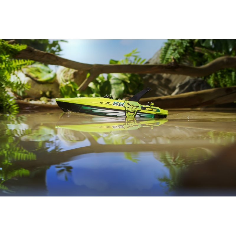 Dankzij de full-function besturing kun je vooruit, achteruit en scherp sturen voor snelle manoeuvres en spannende waterwedstrijden. De robuuste constructie en het opvallende groene race-design maken deze boot een echte blikvanger voor kinderen vanaf 6 jaar.