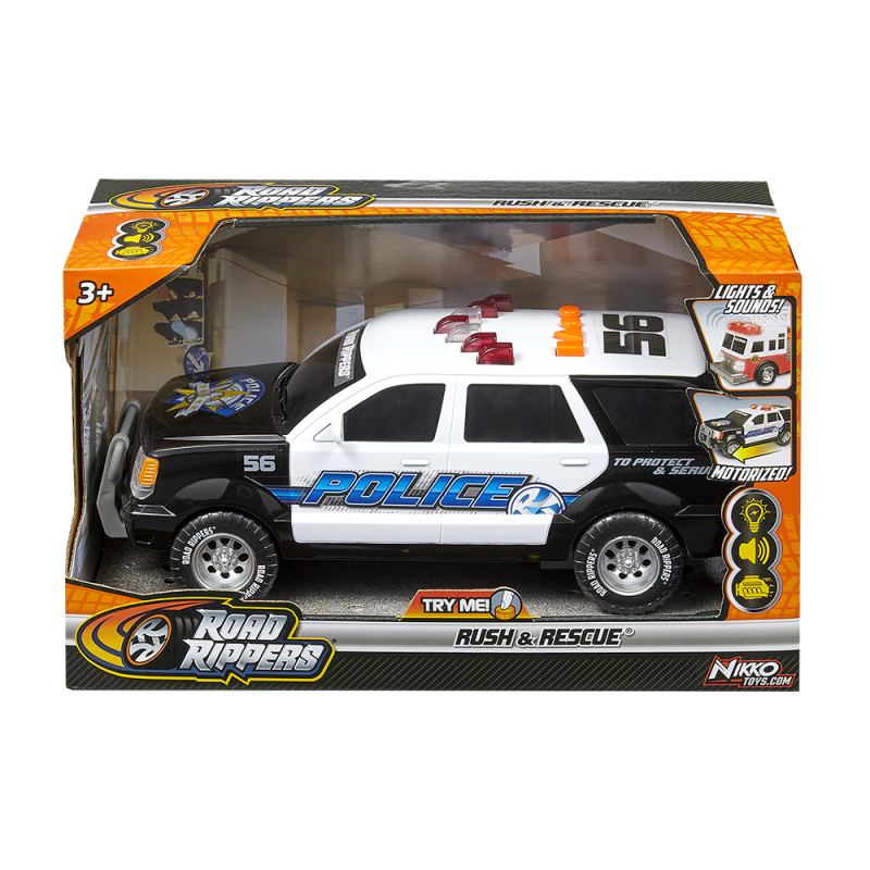 De Nikko Rush & Rescue – Politie SUV brengt actie rechtstreeks naar de speelkamer! Deze indrukwekkende reddingswagen van 30 cm heeft gemotoriseerde voorwaartse aandrijving, waardoor kinderen direct in actie kunnen schieten. Met één druk op de knoppen worden de zwaailichten, realistische sirene- en voertuigguluiden en vocalen geactiveerd — perfect voor spannende politieavonturen.