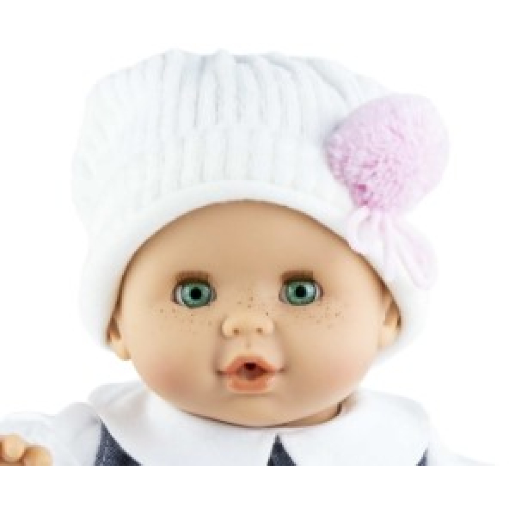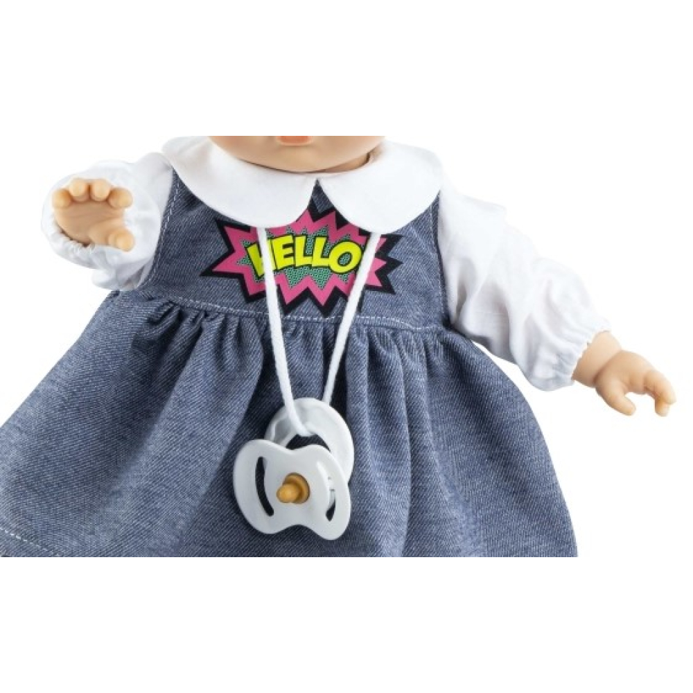 De pop is gemaakt van vinyl met een zacht lijfje en draagt een speelse outfit: een jurkje in jeansblauw met “Hello”-opdruk, witte pofmouwen en kraag, een wit pofbroekje en witte sokjes. Ze is afgewerkt met een roze-witte muts met pompon en wordt geleverd met een speen aan een koord. De pop is zonder mechanisme, wat haar extra geschikt maakt voor jongere kinderen.
