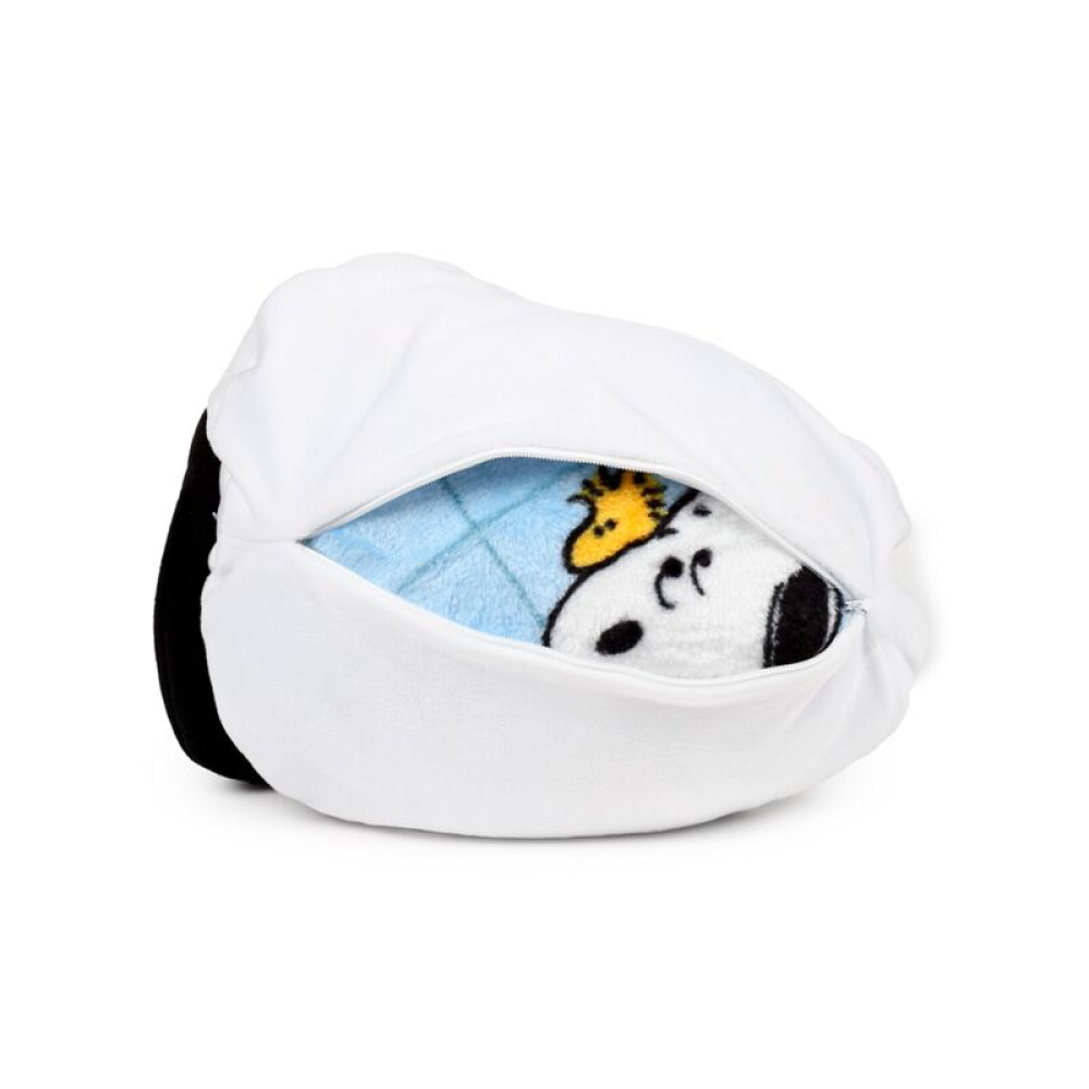 De deken zit netjes opgeborgen in de knuffel: rits Snoopy aan de achterkant open, trek de deken eruit en kruip gezellig weg!
