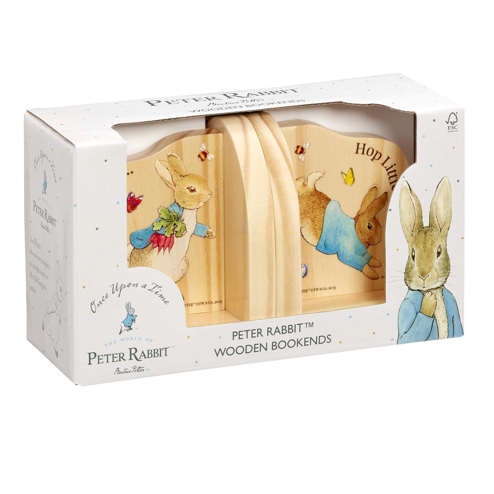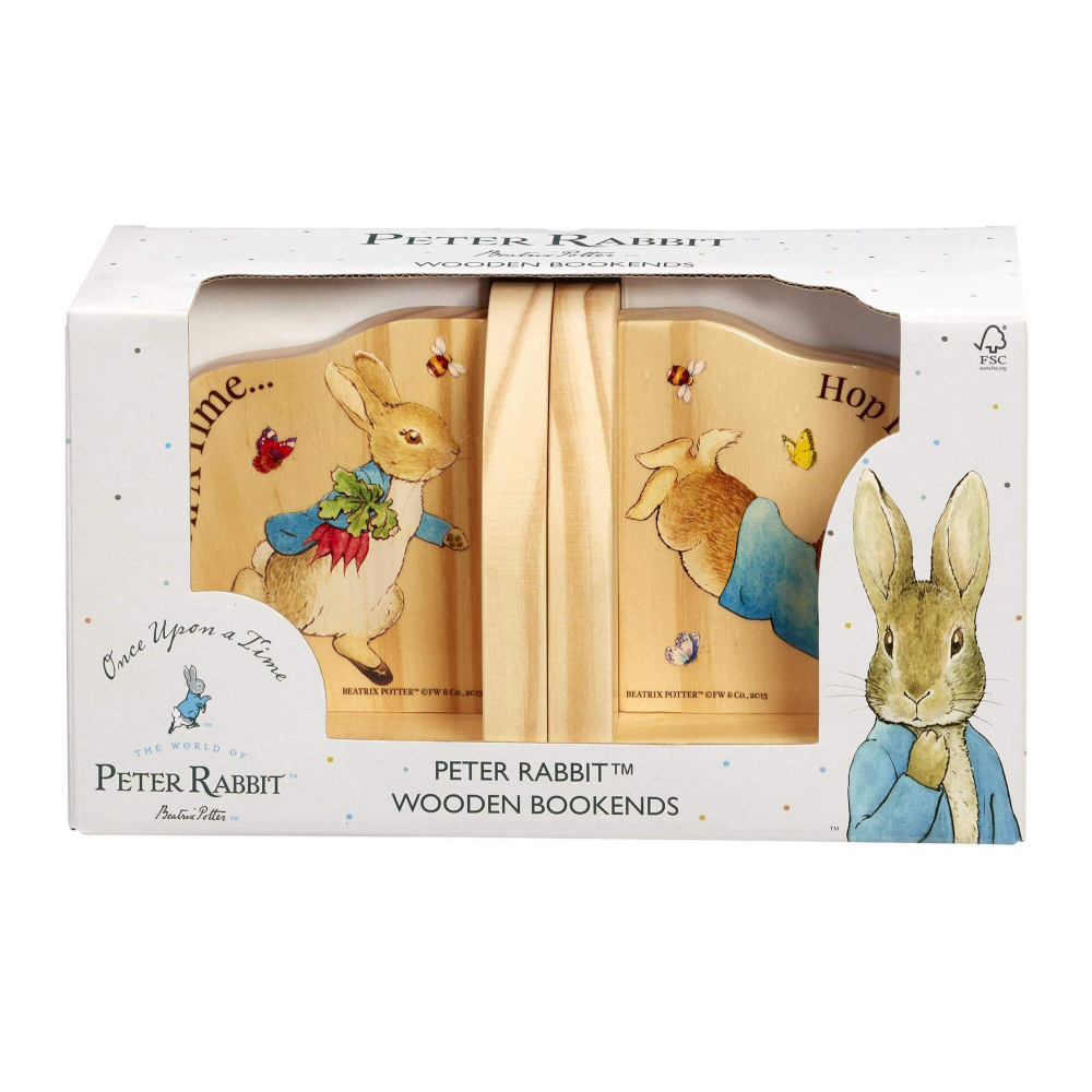 Houd de boeken van uw kleintjes netjes en opgeruimd met deze prachtige Peter Konijn houten boekensteunen uit de Once Upon a Time kinderkamercollectie van Rainbow Designs. Met illustraties uit het verhaal van Peter Konijn van Beatrix Potter zijn deze prachtige boekensteunen een perfecte aanvulling voor elke kinderkamer of speelkamer. Op de ene boekensteun staat Peter Konijn afgebeeld die wortels verzamelt, omringd door vlinders en bijen, met de quote “Once Upon a Time”. Op de andere staat een huppelende Peter Rabbit met de boodschap “Hop Little Rabbit Hop!”. Deze prachtige boekensteunen zijn prachtig gemaakt van hoogwaardig rubberhout en passen perfect bij je Beatrix Potter-collectie. Deze mooie boekensteunen zijn geschikt vanaf 18 maanden en zijn perfect voor een doop- of verjaardag en voegen de charme en het plezier van de verhalen van Beatrix Potter toe aan elke kinderkamer of speelkamer.