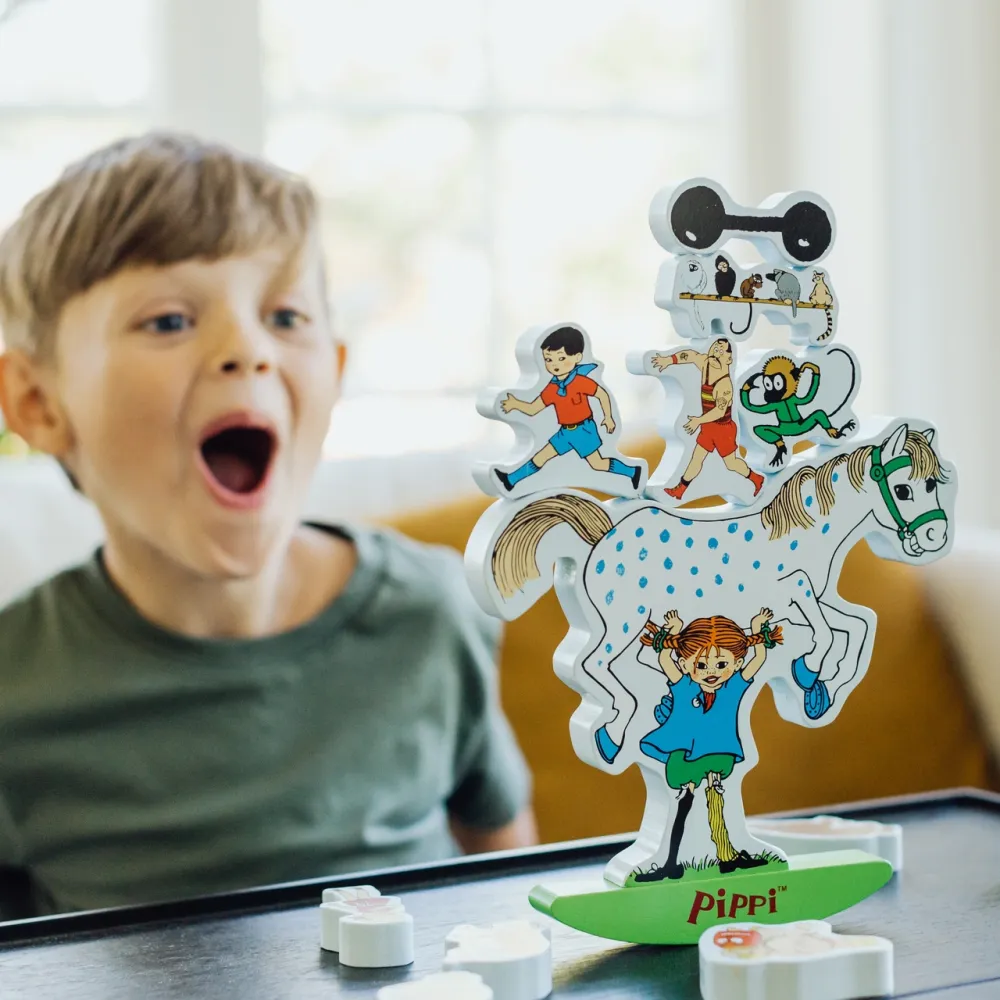 Pippi Langkous is het sterkste meisje ter wereld! Met dit leuke houten balansspeelgoed kan Pippi alles dragen wat ze tegenkomt. Kijk hoeveel stukjes je kunt balanceren voordat ze omvallen. Bevat 12 houten stukken die net zo leuk zijn om afzonderlijk mee te spelen als om te balanceren.