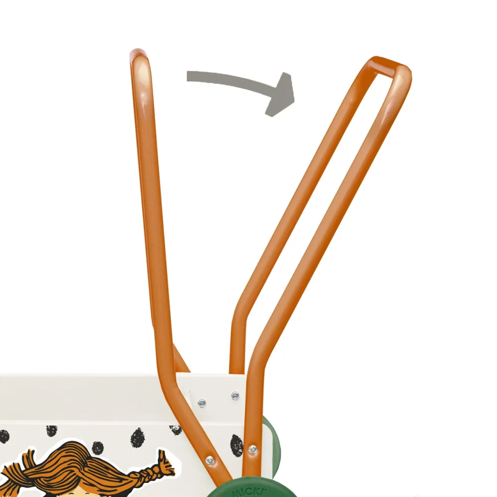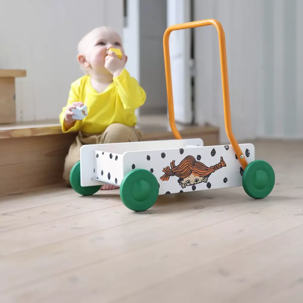 Houten loopwagen van Pippi! De wagen biedt stabiele en veilige ondersteuning bij de eerste stapjes van het kind en heeft vergrendelbare wielen en een verstelbare handgreep. Als het kind eenmaal heeft leren lopen, kan het handvat worden versteld en is het ineens een leuk speelkarretje voor meerdere jaren. Misschien moeten de blokken ergens heen vervoerd worden, of wil meneer Nilsson misschien meerijden? Laat het spel de reis begeleiden!
