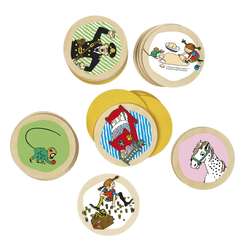 Leuke spelletjes voor kinderen van Pippi! Bij het spel gebruik je je geheugen om de meest overeenkomende paren te verzamelen. Het memoryspel is gemaakt van hout en bevat 38 ronde tegels (19 paar) met Pippi-motieven en spelregels. Een leuk spel voor kinderen dat plezier biedt voor het hele gezin! De spelregels vind je in het pakket.