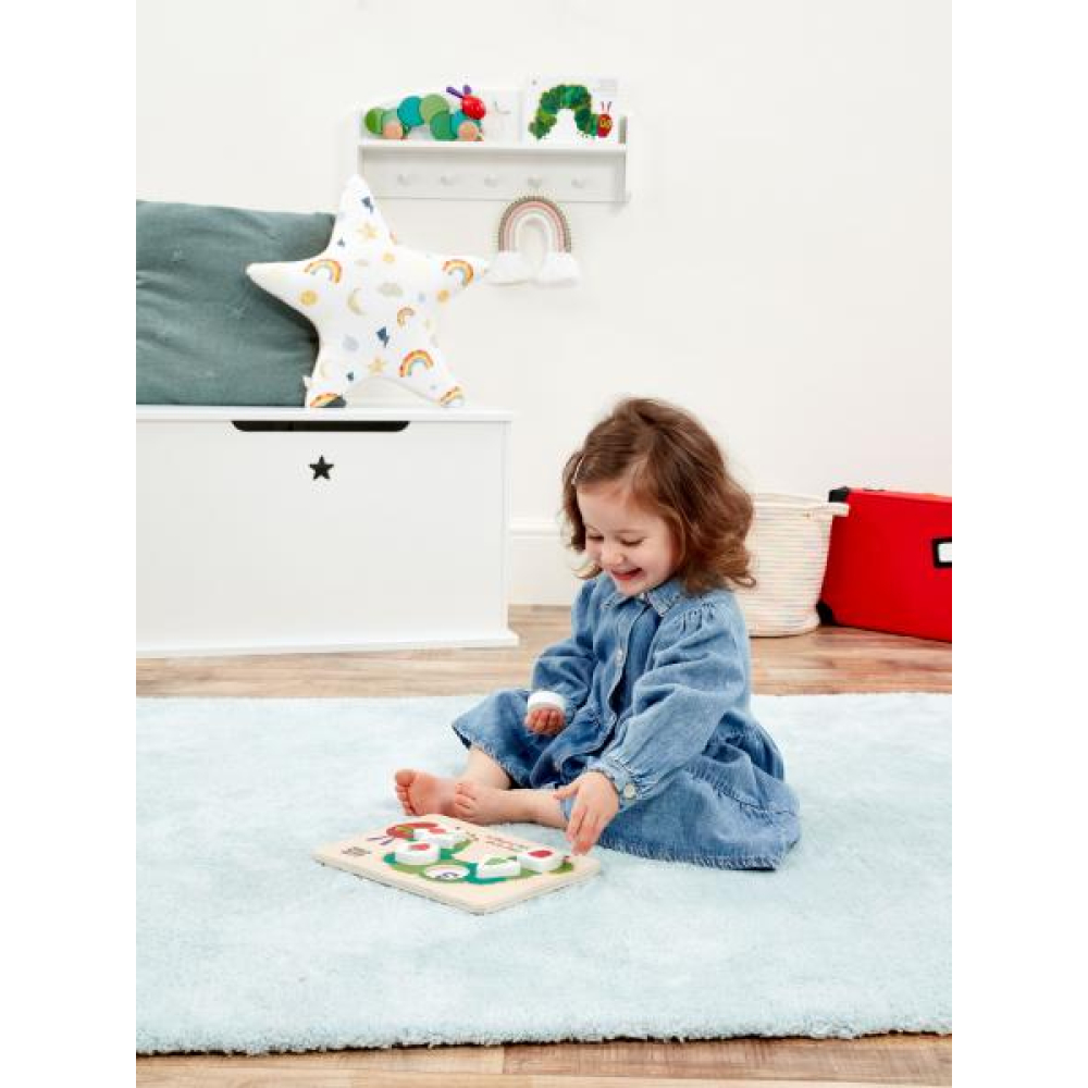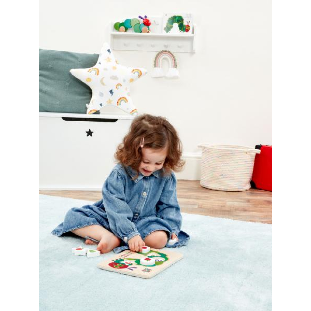 Rupsje Nooitgenoeg is druk bezig geweest zich een weg te knagen door heel veel fruit en kleintjes zullen het geweldig vinden om te proberen de vijf verschillende houten vormen, bedrukt met de heerlijke vruchten, in deze kleurrijke houten vormenpuzzel van Rainbow Designs bij elkaar te passen! De kleintjes zullen veel plezier hebben met het zoeken naar de nummers achter de vormen en met het bij elkaar passen van de verschillende houten vormen, waaronder een driehoek, zeshoek en ster, terwijl ze spelenderwijs leren om de stukjes terug in de puzzel te leggen. Deze speelse, opvallende houten vormenpuzzel met de beroemde rups van Eric Carle is perfect om kleintjes kennis te laten maken met vormen, kleuren en getallen, en helpt ook bij het ontwikkelen van de oog-handcoördinatie en fijne motoriek. Geschikt vanaf 24 maanden.