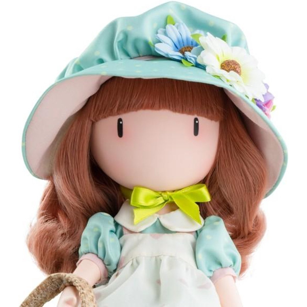 De pop draagt haar rode haar verborgen onder een bloemenhoed die perfect past bij haar jurk. Ze is gekleed in een blauwe jurk met stippen, een wit schort met hartjes, een roze onderrok, lichte kousen en roze laarsjes. In haar hand houdt ze een tasje met een schaapje. Zoals typisch voor Gorjuss-poppen heeft ze geen mond of neus, enkel de kenmerkende langgerekte ogen. De pop is gemaakt van stevig vinyl, heeft beweegbare armen en benen en is subtiel geparfumeerd met roos en kamperfoelie. Geleverd in een stijlvolle geschenkdoos.