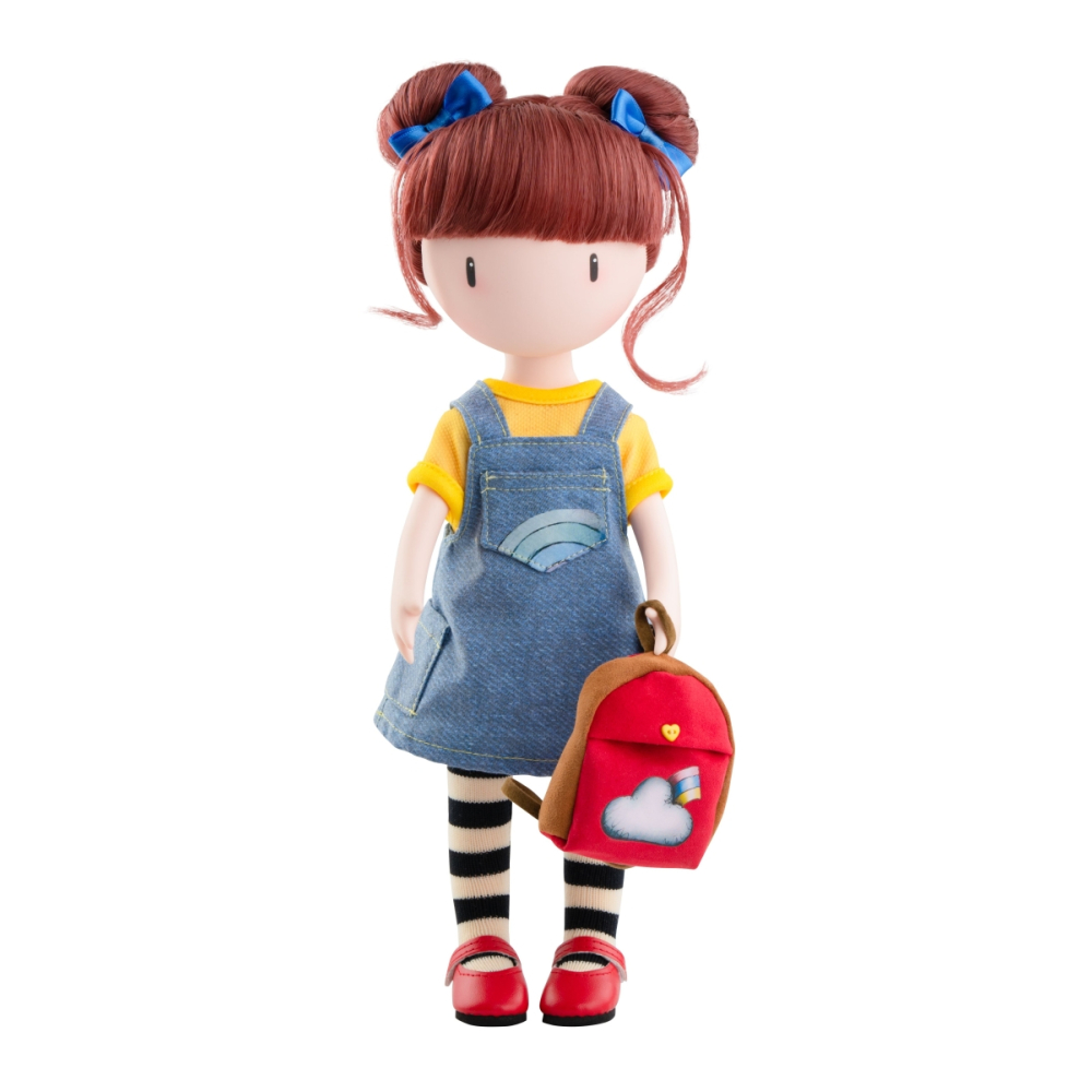 De pop is volledig gemaakt uit hoogwaardig vinyl en beschikt over klassieke gewrichten aan hoofd, armen en benen. Ze draagt een gele T-shirt, een denim salopettejurk, gestreepte kousen en rode Mary Jane schoenen, afgewerkt met een rood-bruine rugzak. De zachte geur van roos en kamperfoelie zorgt voor een extra zintuiglijke beleving. Geleverd in een stijlvolle presentatiebox met authenticiteitslabel.