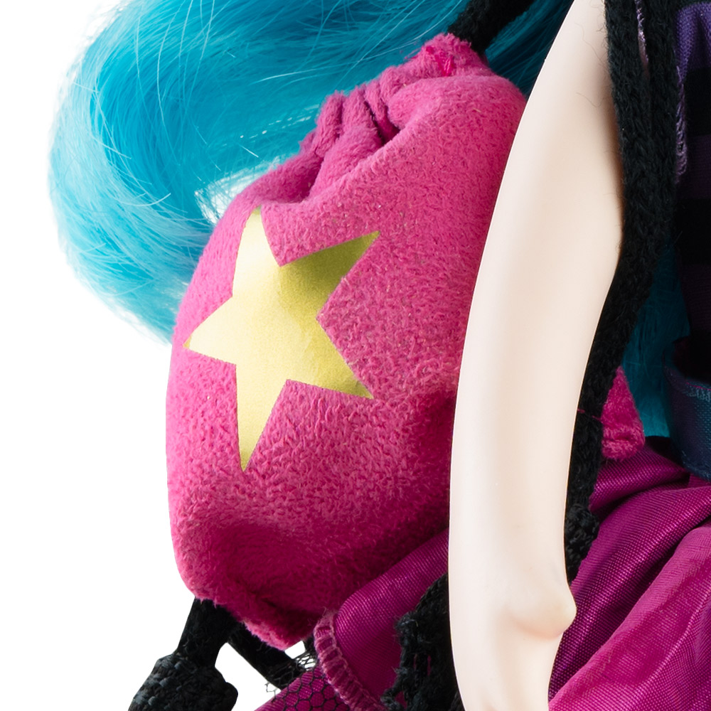 Hoop-La heeft opvallend lang kauwgomblauw haar en draagt een gestreept gympakje over een fuchsia rok met ruches en blauwe randen, sterrendetails en tule. Ze heeft gestreepte gebreide sokken, lila Mary Janes en een haarband met sterrendetail. Ze draagt een nonchalante fuchsia tas met stermotief over één schouder en is geparfumeerd met rozen- en kamperfoeliegeur. Met haar bewegende ledematen en intreden kan ze zelfstandig opstaan, dus ze is klaar voor elk avontuur! De perfecte aanvulling op elke Gorjuss-collectie.