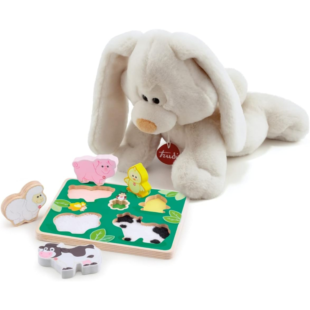 Vormenpuzzel met verschillende voelervaringen onder de dieren. De diertjes kunnen ook rechtop staan, waardoor er ook mee gespeeld kan worden.