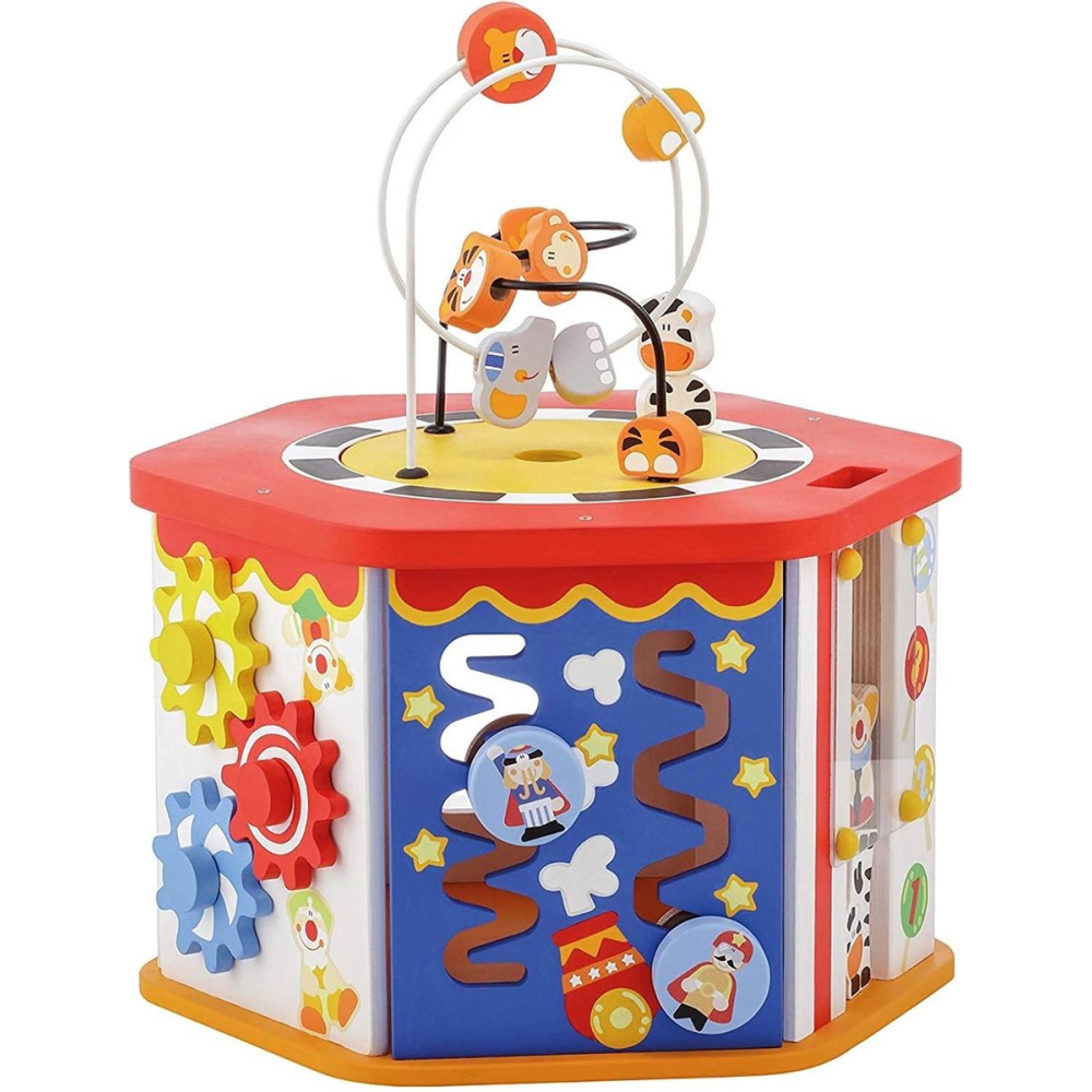 Voorzien van tandwielen, puzzels, kralenspiraal, vormenstoof stimuleert deze activiteitenkubus de handvaardigheid en logische associaties.