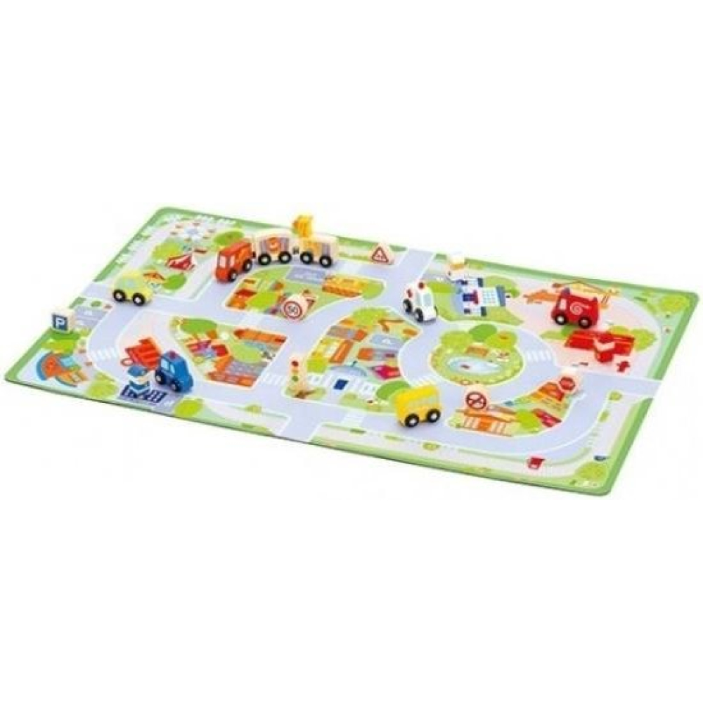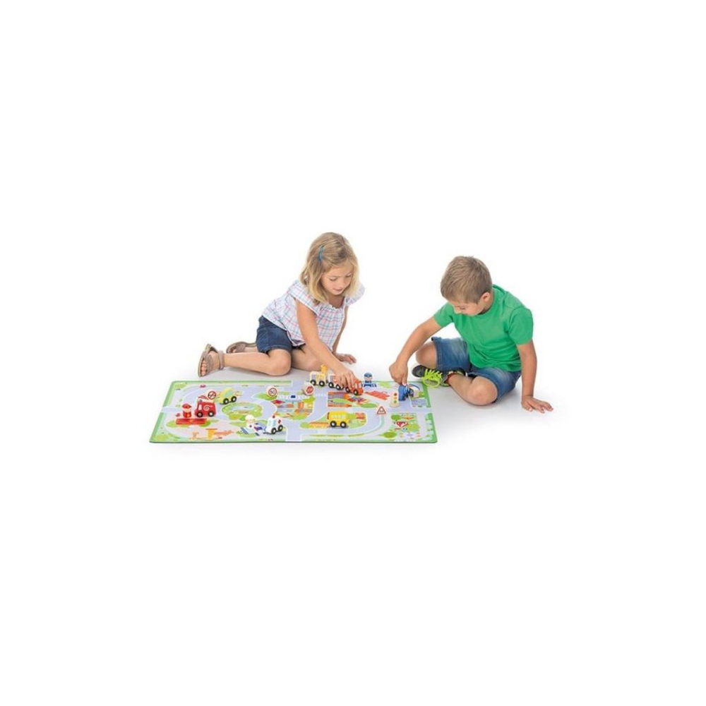 Een super leuk speelkleed met accessoires. Rij over de brede wegen met een van de vele auto's. Bij het speelkleed worden acht voertuigen, zes borden en drie poppetjes geleverd.