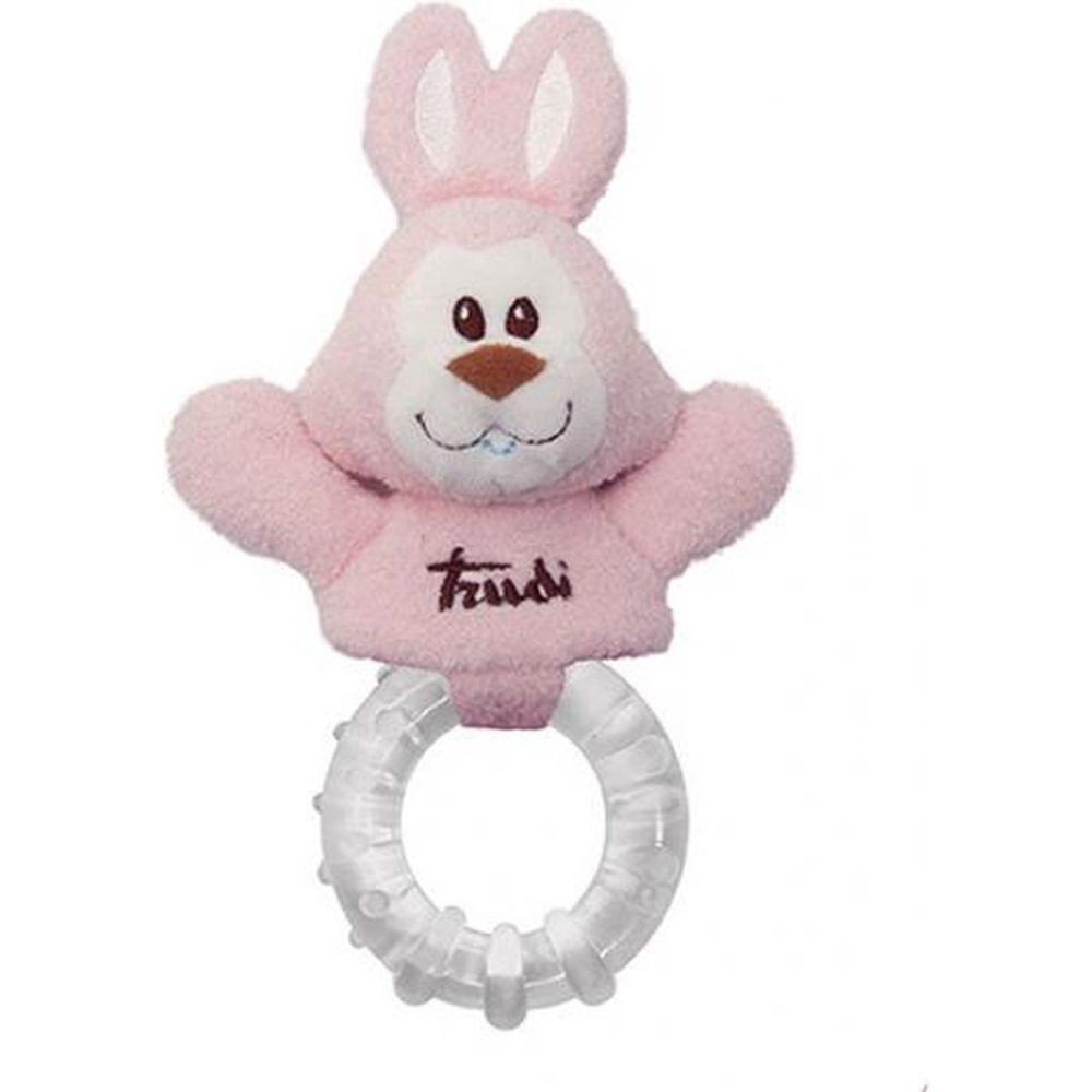 Een stevige plastic bijtring van Trudi. De ring is kleurloos. Bovenaan de ring is een konijn te vinden, deze is eenvoudig van de ring te halen.